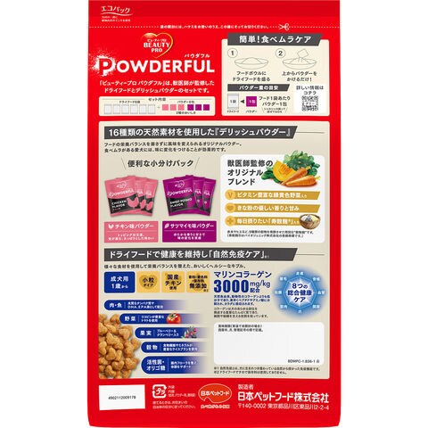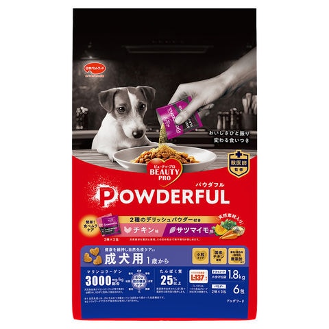 メーカー画像 ドッグフード ビューティープロ ドッグ パウダフル 成犬用 チキン味・サツマイモ味パウダー付き 1.836kg 4902112009178 犬フード 犬 イヌ いぬ dog DOG 総合栄養食 犬用 いぬ用 イヌ用 犬の餌 犬えさ 犬餌 ペットフード どっぐふーど カリカリ 小粒 デリッシュパウダー 味に変化 風味を変える ふりかけ トッピング パウダー パウダー付き 食べムラ 獣医師監修 オリジナルブレンドパウダー チキン 鶏肉 きな粉 緑黄色野菜 さつまいも 天然素材 寿穀麹 成犬用総合栄養食 成犬 成犬用 1歳以上 マリンコラーゲン 乳酸菌 L-137 免疫力ケア 国産 日本産 powderful beautypro 日本ペットフード 20250904 y25m09 ngtk bpdpowderful