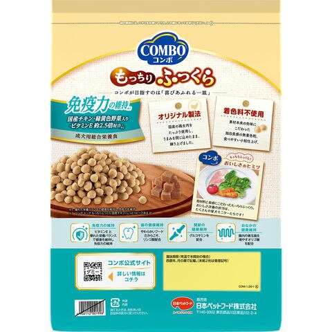 メーカー画像 ドッグフード コンボ ドッグ もっちりふっくら 免疫力の維持 1.26kg(90g×14袋) 4902112021996 犬フード 犬 イヌ いぬ dog DOG 総合栄養食 犬用 いぬ用 イヌ用 犬の餌 犬えさ 犬餌 ペットフード どっぐふーど セミモイスト 半生 成犬用 1歳以上 1歳から 総合栄養食 小分けパック ふわふわ食感 小粒タイプ 小粒 食べやすい もっちり 国産 日本産 鶏生肉 鶏肉 チキン ささみ粒 ササミ粒 トッピング 具材入り 緑黄色野菜 リンゴ酸 歯の健康維持 ビタミンE 免疫力ケア 免疫力の維持 免疫力 グルコサミン 関節の健康維持 関節 オリゴ糖 お腹の健康維持 お腹 乳酸菌 L-137 日本ペットフード 着色料不使用 無着色 20250905 y25m09 ngtk bnr2511wannih bnr2511wanall