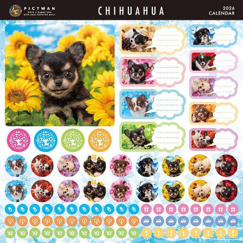 2026年 壁掛けカレンダー PICTWAN チワワ カレンダー 犬 4589860481854 20250815 y25m09 ktym カレンダー チワワ 可愛い 写真 カラフル 花 植物 インパクト 書き込み しやすい インテリア 華やか フォトシール スケジュールシール オリジナルシール 壁掛け用 ブックレット式 中とじ 子犬 幼犬 スマホ壁紙 プレゼント ドッグ DOG 仔犬 いぬ イヌ キュート 表情 L版 大判 フォトグラファー シール シールセット 画像 ダウンロード QRコード animal ピクトワン
