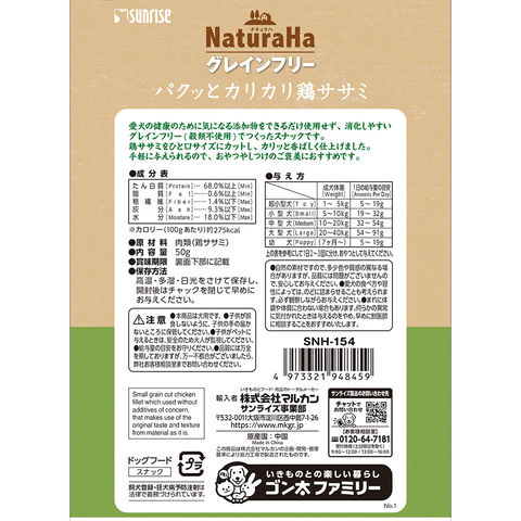 frditem_hidden メーカー画像 ナチュラハ グレインフリー パクッとカリカリ鶏ササミ 50g 犬 おやつ 4973321948459 SNH-154 犬フード イヌ いぬ dog DOG 犬用 いぬ用 イヌ用 犬の餌 犬えさ 犬餌 ペットフード どっぐふーど オヤツ トリーツ 犬おやつ スナック 生後7ヶ月から ジャーキー ひとくちサイズ 一口サイズ パクっと カリカリ カリッと 香ばしい 鶏ささみ ささみ ササミ 鶏肉 チキン 穀物不使用 消化しやすい しつけ ご褒美 ごほうび 手軽に与えられる 無添加 チャック付き サンライズ sunrise 20250917 y25m09 ngtk ドッグフード
