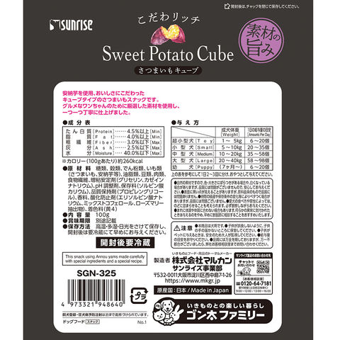 frditem_hidden メーカー画像 こだわリッチ さつまいもキューブ 100g 犬 おやつ 4973321948640 SGN-325 犬フード イヌ いぬ dog DOG 犬用 いぬ用 イヌ用 犬の餌 犬えさ 犬餌 ペットフード どっぐふーど オヤツ トリーツ 犬おやつ スナック サツマイモ 安納芋 キューブタイプ 生後7ヶ月から 厳選した素材 素材の旨み チャック付き 国産 日本産 サンライズ sunrise 20250918 y25m09 ngtk ドッグフード