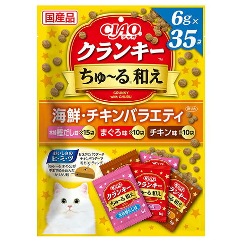 メーカー画像 いなば CIAO クランキ―ちゅ~る和え 35袋入り 海鮮・チキンバラエティ 6g×35袋 16個 4901133331640 2250003572990 20250828 y25m08 ktym 猫フード ねこフード キャットフード 猫おやつ オヤツ えさ 餌 ご褒美 ちゅーる チャオチュール ちゅ~るまぐろ マグロ カツオ ヤキアゴ 焼きあご 粒 つぶ 大袋 大容量 国産 日本産 INABA P-348 ネコフード おやつ 間食 ご飯 ごはん キャットフード フード 魚 さかな フィッシュ 鶏肉 鶏 肉 チキン 複数売り