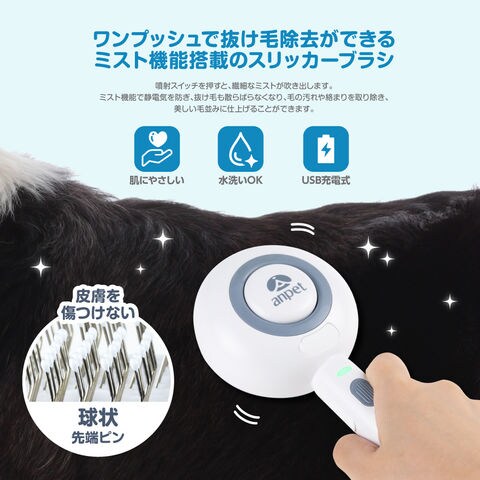 メーカー画像 スリッカーミストブラシ ホワイト アンサー ブラシ 4571648650033 犬 猫 いぬ ねこ 小型犬 中型犬 大型犬 イヌ ネコ ドッグ キャット dog cat イヌ用 ネコ用 いぬ用 ねこ用 犬用 猫用 犬用品 猫用品 いぬ用品 ねこ用品 イヌ用品 ネコ用品 用品 ケア用品 ブラッシング マッサージ ミスト 噴霧機能 噴霧式 抜け毛飛散防止 静電気防止 毛の汚れ除去 毛が散らばらない 皮膚を傷つけない 軽量設計 スリッカーブラシ ステンレスピン ピン先 丸型加工 球状先端ピン USB 充電式 バッテリー内蔵 水洗いOK 水洗い可 白 white ANP-W003WH 20250910 y25m09 ngtk bnr2309catite