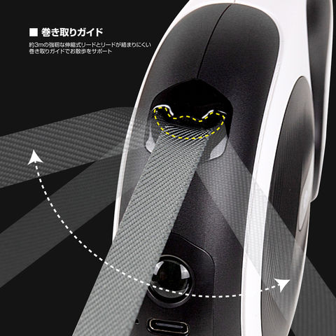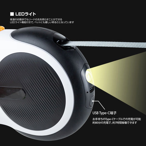 | 特長 | ●体重50kg以下の小型犬・中型犬用LEDライト付きの伸縮式リードです。 ●約5mの強靭な伸縮付きリードとリードが絡まりにくい巻取りガイドでお散歩をサポートします。 ●わずか290gで長時間お使いいただいても疲れにくい軽量設計です。 ●ワンタッチでリードを一時停止できるストッパーボタンとロックが可能なスイッチボタンを採用しています。 ●夜道のお散歩でも先を照らすことができるLEDライト機能付きで、愛犬にも優しい明るさとなっています。 |