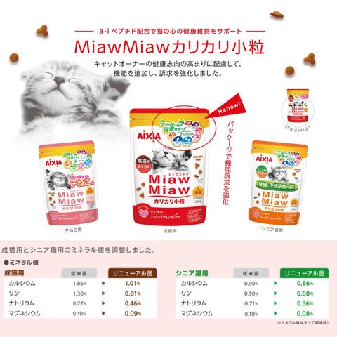 キャットフード アイシア MiawMiawカリカリ小粒 シニア猫用 580gセット パウチのおまけ付 カリカリ小粒 まぐろ味 580g 4580101261143 猫 ねこ 猫用 ねこ用 キャット cat 猫フード ペットフード フード 餌 エサ ごはん 総合栄養食 ドライフード ドライ シニア シニア猫 高齢 高齢猫 老猫 シニア用 高齢用 高齢猫用 老猫用 ペプチド マグネシウム 下部尿路 タウリン まぐろ 鮪 まぐろ節 ツナ 魚 さかな フィッシュ かつお味 4580101261150 セット フードセット アソート ウェットフードセット kak 20250904 y25m09 line2512aixia