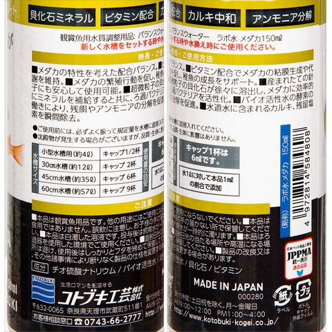 コトブキ工芸 ラボ水 メダカ 150ml コンディショナー 4972814584808 熱帯魚 目高 観賞魚 アクアリウム アクアリウム用品 水質調整剤 ビタミン コトブキ 寿 KOTOBUKI 21591297 MEDAKA めだか バランスウォーター BALANCE WATER LAB SUI 粘膜生成 代謝維持 繁殖行動促進 稚魚の成長 針子 ミネラルを補給 ろ過バクテリア活性化 バイオ活性水 酵素 残餌 アンモニア 分解 カルキ抜き カルキ 残留塩素 瞬間除去 国産 日本産 20260401 y26m04 ngtk