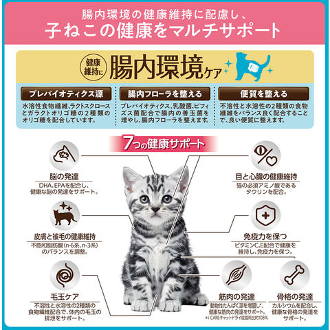 ●子猫の健康な成長に配慮して、動物性たんぱく源を増量し(約108%※)健康な筋肉の発達を、カルシウムを配合し健康な骨格の発達を、DHA、EPAを配合し健康な脳の発達をサポートします。