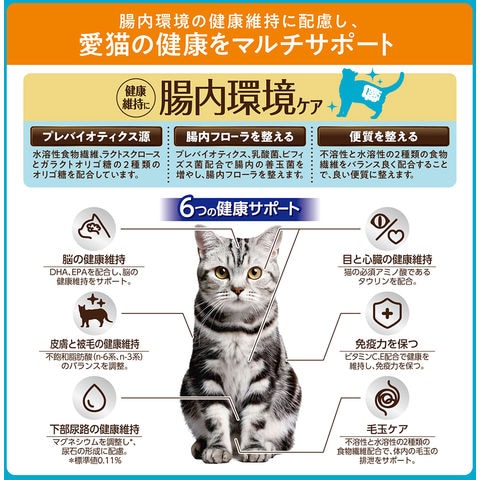 | 特長 | ●成猫の健康をマルチサポートするドライフードです。 ●腸内環境の健康維持に配慮して、プレバイオティクス源の水溶性食物繊維、2種類のオリゴ糖を配合しました。 ●成猫の下部尿路の健康維持のため、マグネシウムを調整し尿石の形成に配慮しました。 ●免疫力、下部尿路、毛玉、目と心臓、皮膚・被毛、脳の健康をサポートします。 |