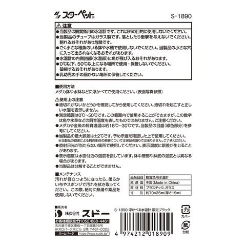 | ご注意 | ※本品は観賞魚用の水温計です。目的以外の用途では使用しないでください。 |