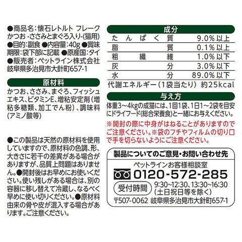 メーカー画像 懐石レトルト フレーク かつお ささみとまぐろ入り 40g×12 4902418004792 猫 ねこ ネコ 猫用 キャットフード ウェットフード パウチ キャット cat CAT ねこ用 猫フード キャットフード 猫餌 猫えさ ウェット ウエットフード ウエット 懐石 レトルト 袋から出しやすい 魚介 マグロ 鮪 カツオ 鰹 ささみ ササミ 鶏ささみ 鶏ササミ 鶏肉 チキン フィッシュ ペットライン petline 2250003584443 複数売り 20250919 y25m09 ngtk