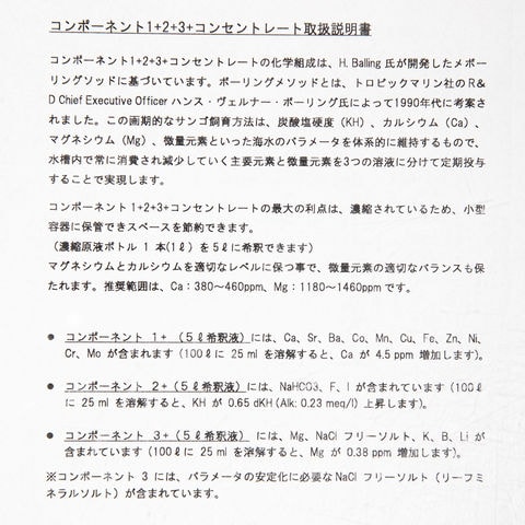 Component 1+:Ca、Sr、Ba、Co、Mn、Cu、Fe、Zn、Ni、Cr Component 2+:NaHCO3、F、I Component 3+:Mg、リーフミネラルソルト、K、B |