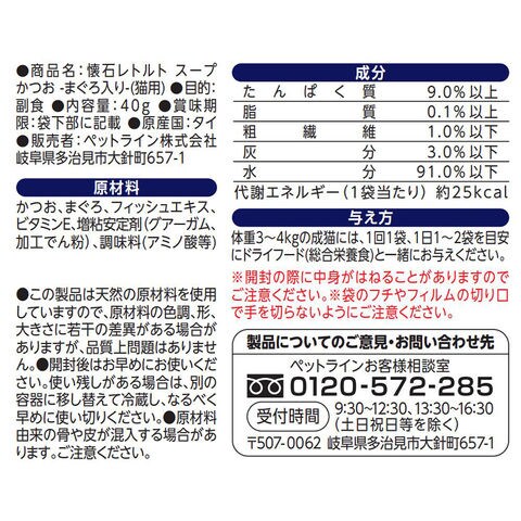 メーカー画像 懐石レトルト スープ かつお まぐろ入り 40g×12 4902418004853 猫 ねこ ネコ 猫用 キャットフード ウェットフード パウチ キャット cat CAT ねこ用 猫フード キャットフード 猫餌 猫えさ ウェット ウエットフード ウエット 懐石 レトルト 魚介 マグロ 鮪 カツオ 鰹 フィッシュ ペットライン petline 2250003584566 複数売り 20250919 y25m09 ngtk