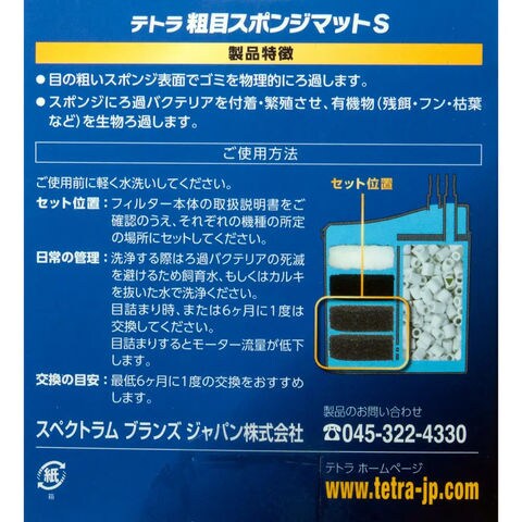 【外部フィルター】 ●水槽の横にも設置可能な、置き場所自由の外部式フィルターです。 ●水中モーター採用で運転音が静かです。 ●呼び水不要で、コンセントを入れるだけで簡単にスタートできます。 ●内径8mmホースの採用で関連機器との接続もスムーズにできます。 ●4種のオリジナルろ過材が強力ろ過を実現します。 【粗目スポンジマット】 ●目の粗いスポンジ表面でゴミを物理的にろ過します。 ●スポンジにろ過バクテリアを付着、繁殖させ、有機物(残餌、フン、枯葉など)を生物ろ過します。 ●最低6ヶ月に1度の交換をおすすめします。 【カーボンマット/ウールセット】 ●物理的なゴミをキャッチ、ニオイ、飼育水の着色汚れを吸着します。 ●カーボンがにごり、黄ばみ、悪臭を吸着します。 ●目の細かい素材で、細かい汚れをキャッチします。 ●最低1ヶ月に1度交換してください。 【グラスリング】 ●連続多孔質構造が水流を分散し、ろ過能力がアップします。 ●バクテリアの繁殖を促す生物ろ過を行うと同時に、様々な方向を向いた穴が大きなゴミなどを物理的にろ過しながら、水の流れを分散させて、フィルター全体に行き渡らせます。 ●表面の汚れが落ちなくなったら交換をおすすめします。 |