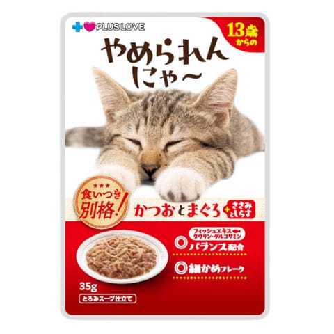 プラスラブ やめられんにゃ~ 13歳からのかつおとまぐろ+ささみとしらす とろみスープ仕立て 35g キャットフード ウェットフード 関東当日便