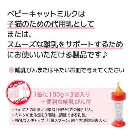 保証成分 【ベビーキャットミルク】たんぱく質:31.0%以上、脂質:37.0%以上、粗繊維:1.0%以下、粗灰分:5.5%以下、水分:3.5%以下、食物繊維:0.5%