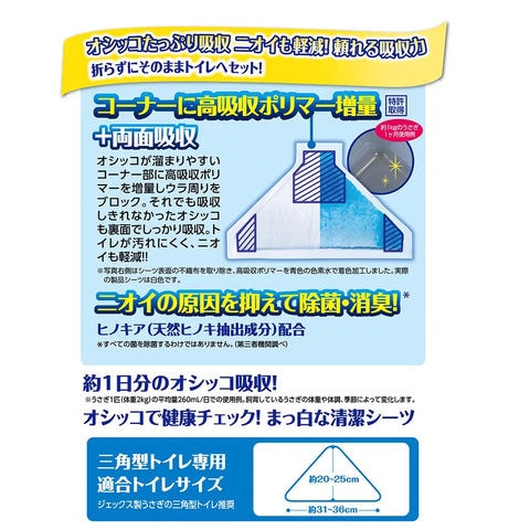 | 特長 | ●折らずに三角トイレにセットできるトイレシーツです。 ●オシッコがたまりやすいコーナー部に高吸収ポリマーを増量しウラ周りをブロックします。 ●吸収しきれなかったオシッコは裏面でしっかり吸収します。 |