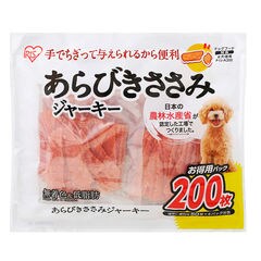| 特長 | ●ガムをささみで巻いたささみ巻きジャーキーです。 ●長くしっかり噛める、ガムタイプです。 ●愛犬の健康に配慮し、無着色&低脂肪※にしています。(※アイリスオーヤマ ビーフジャーキーの約70%カット) ●農林水産省より指定加熱処理施設として認定された工場でつくりました。 |