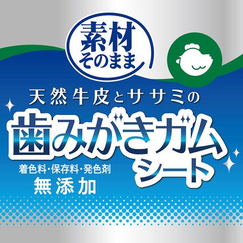 | 特長 | ●コラーゲン繊維豊富な天然牛皮に低脂肪、良質たん白質豊富で旨味たっぷりなササミを練りこみ、さらにササミ粒を入れることでおいしくデンタルケアします。 ●かむことでコラーゲン繊維が汚れをからめて落とします。 ●着色料、保存料、発色剤、酸化防止剤不使用です。 ●食べごたえ抜群のシート形状です。 |
