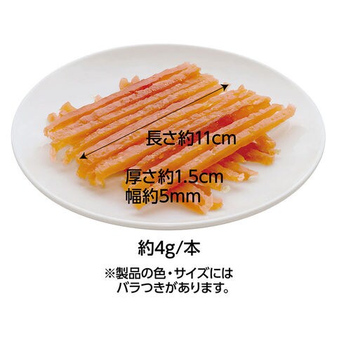 | 特長 | ●低脂肪で良質たん白質豊富な鶏ササミを100%使用しています。 ●小型犬、シニア犬にも食べやすいしっとりやわらか仕立てです。 ●好みのサイズにちぎって与えやすい細切り形状です。 ●着色料、保存料、発色剤、酸化防止剤不使用、グレインフリーです。 |
