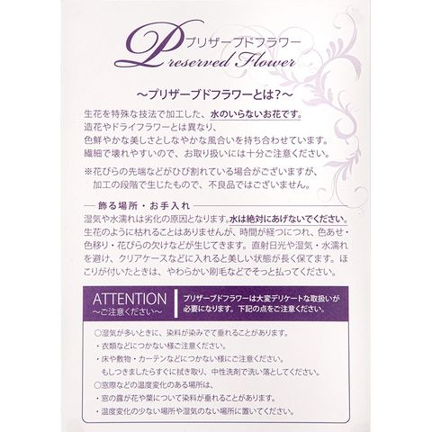 | ご注意 | ※繊細で壊れやすいので、お取り扱いには十分ご注意ください。 ※湿気や水漏れは劣化の原因となります。水は絶対にあげないでください。 ※枯れることはありませんが、時間が経つにつれ、色あせ・色移り・花びらの欠けなどが生じてきます。 |
