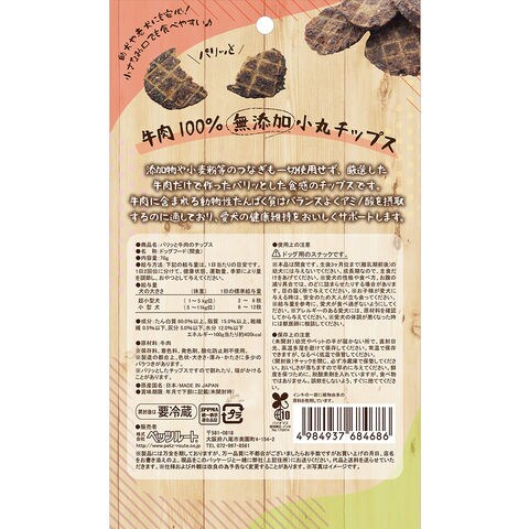 | 特長 | ●添加物や小麦粉等のつなぎも一切使用せず、厳選した牛肉だけで作ったパリッとした食感のチップスです。 ●牛肉に含まれる動物性たんぱく質はバランスよくアミノ酸を摂取するのに適しています。 ●幼犬、シニア犬におすすめです。 |