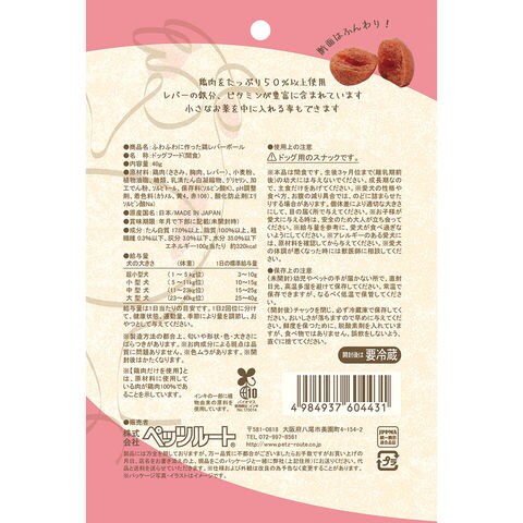メーカー画像 ペッツルート ふわふわに作った鶏レバーボール 40g 4984937604431 犬 いぬ イヌ 犬用 いぬ用 dog DOG ドッグフード 犬フード 犬おやつ おやつ 間食 スナック ご褒美 ごほうび 鶏 チキン 鶏肉 鶏ささみ 鶏ササミ ささみ ササミ 鶏胸肉 鶏むね肉 胸肉 むね肉 鶏レバー レバー ふんわり やわらかい 国産