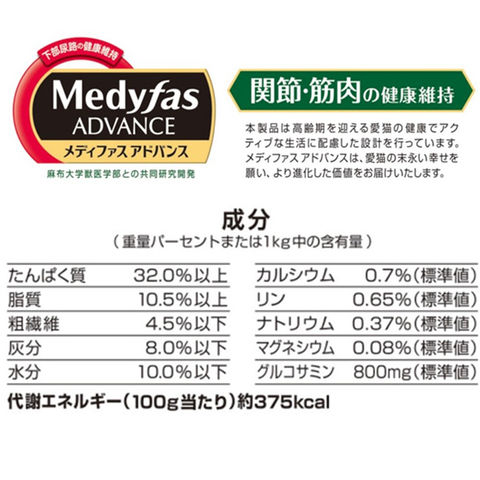 | 特長 | ●高齢期の愛猫の健康でアクティブな生活に配慮した総合栄養食です。 ●β-グルカン、ビタミン配合で健康の維持をサポートします。 ●メディファスアドバンスは、愛猫の末永い幸せを願い、より進化した価値をお届けします。 |