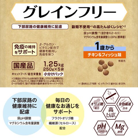 | 特長 | ●本製品は下部尿路の健康維持とグレインフリーを両立した栄養設計を実現しました。 ●本能に訴えかけるチキン&フィッシュ味でシリーズ内でも屈指の嗜好性を獲得しています。 ●フラクトオリゴ糖、繊維源(セルロース)配合で、健康な便通と便臭に配慮しています。 |
