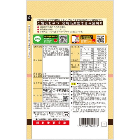 | 特長 | ●宮崎県産鶏ささみ肉を使用した着色料無添加のおやつです。 ●小型犬やシニア犬も食べやすい薄切り、やわらか仕上げです。 ●今までのおやつでは物足りない、グルメな愛犬におすすめです。 |