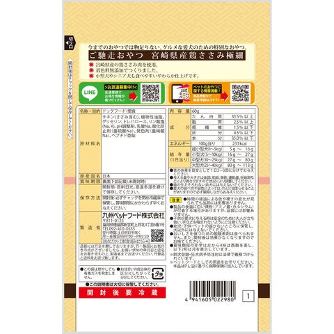 メーカー画像 ご馳走おやつ 宮崎県産鶏ささみ極細 60g 4941605022980 犬 いぬ イヌ 犬用 いぬ用 dog DOG ドッグフード 犬フード 犬おやつ おやつ 間食 スナック ご褒美 ごほうび 日本産 九州ペットフード 鶏 チキン 鶏肉 鶏ささみ 鶏ササミ ささみ ササミ 極細 やわらかい 犬餌 犬の餌 犬えさ Q-Pet トリーツ 柔らかい やわらか 柔らか 食べやすい 小型犬 シニア犬 高齢犬 老犬 グルメな愛犬 無着色 国産 日本産 20251219 y25m12 ngtk