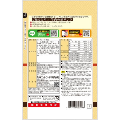 メーカー画像 ご馳走おやつ 牛肉の鱈サンド 60g 4941605023093 犬 いぬ イヌ 犬用 いぬ用 dog DOG ドッグフード 犬フード 犬おやつ おやつ 間食 スナック ご褒美 ごほうび 日本産 九州ペットフード 牛 ビーフ 牛肉 鱈シート やわらかい 犬餌 犬の餌 犬えさ Q-Pet トリーツ 柔らかい やわらかく 柔らかく 食べやすい グルメな愛犬 やわらか 柔らか 食べやすい 与えやすい 小型犬 シニア犬 高齢犬 老犬 国産 日本産 20251223 y25m12 ngtk