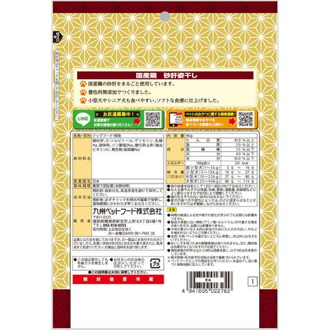 | 特長 | ●国産鶏の砂肝をまるごと使用して仕上げました。 ●着色料を無添加でつくりました。 ●小型犬やシニア犬も食べやすい、ソフトな食感に仕上げました。 |