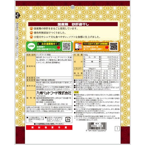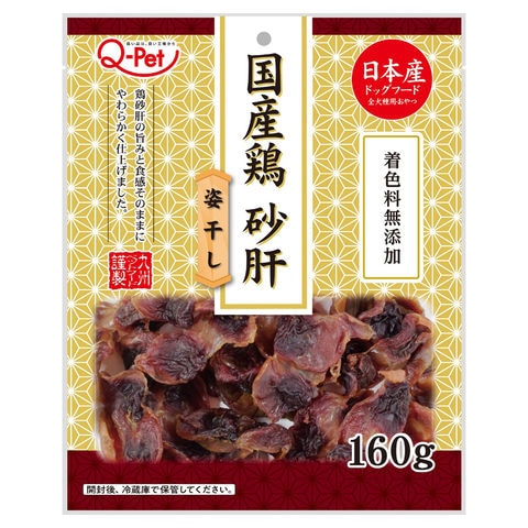 メーカー画像 Q-Pet 国産鶏 砂肝姿干し 160g 4941605022843 犬 いぬ イヌ 犬用 いぬ用 dog DOG ドッグフード 犬フード 犬おやつ おやつ 間食 スナック ご褒美 ごほうび 日本産 九州ペットフード 鶏 チキン 鶏砂肝 鶏すなぎも 砂肝 すなぎも 無着色 素材そのまま ソフトな食感 満足感 食べ応え 食べやすい 小型犬 シニア犬 高齢犬 老犬 無添加 チャック付き 国産 20260122 y26m01 ngtk