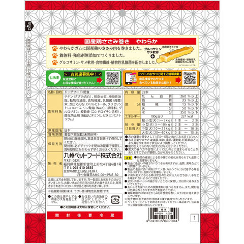 メーカー画像 Q-Pet 国産鶏 ささみ巻き やわらか 22本 4941605022904 犬 いぬ 犬用 いぬ用 dog ドッグフード 犬フード 犬おやつ おやつ 間食 スナック ご褒美 ごほうび 日本産 九州ペットフード 鶏 チキン 鶏肉 鶏ささみ ささみ やわらかい グルコサミン サメ軟骨 食物繊維 植物性乳酸菌 スティック 国産 大袋 20260210 y26m02 ngtk