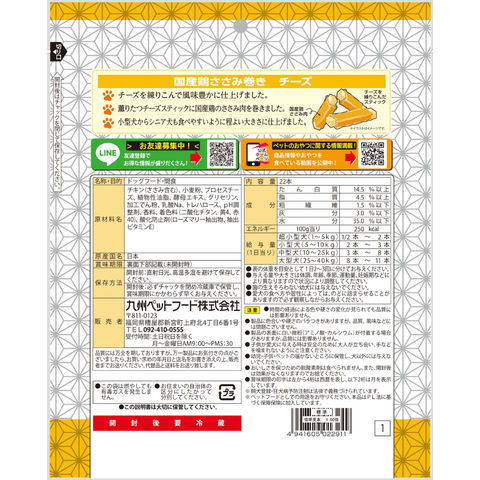 メーカー画像 Q-Pet 国産鶏 ささみ巻き チーズ 22本 4941605022911 犬 いぬ 犬用 いぬ用 dog ドッグフード 犬フード 犬おやつ おやつ 間食 スナック ご褒美 ごほうび 日本産 九州ペットフード 鶏 チキン 鶏肉 鶏ささみ ささみ プロセスチーズ スティック 小型犬 シニア犬 高齢犬 老犬 食べやすい 大袋 国産 20260210 y26m02 ngtk