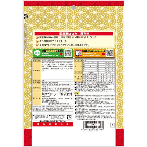 | 特長 | ●国産鶏ささみを使用し、風味が引き立つ薄削りに仕上げました。 ●着色料不使用でつくりました。 ●ちぎりやすいため、お好みの大きさで与えることができます。 |