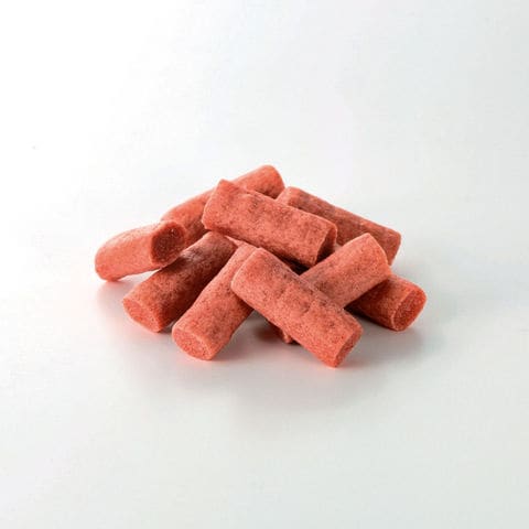 原材料 肉類(チキン、ビーフ)、小麦粉、小麦たん白、植物性油脂、D-ソルビトール、グリセリン、pH調整剤、ミネラル類(Ca、P)、膨張剤、調味料、リン酸塩(Na、K)、保存料(ソルビン酸)、酸化防止剤(ビタミンCナトリウム、抽出ビタミンE)、ビタミンA、発色剤(亜硝酸Na)、着色料(赤40)