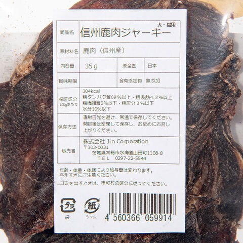 JINJIN 小袋おやつ 信州鹿肉ジャーキー 35g 4560366059914 20251204 y25m12 cngc 小袋 犬用 犬用品 犬 いぬ ドッグ DOG ドッグフード 犬フード 犬猫 いぬねこ 犬猫用 猫用 猫用品 猫 ねこ キャット cat キャットフード 猫フード フード ドライ えさ 餌 おやつ 間食 ジャーキー 鹿肉 信州鹿肉 鹿 しか 信州 信州産 ジンジン JIN Corporation 無添加 日本 日本産 国産 ダイエット 低カロリー 高タンパク たんぱく たんぱく質 鉄分 鉄 DHA ビタミン ミネラル アレルギー 栄養