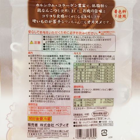| 原材料 | 鶏軟骨、グリセリン、保存料(ソルビン酸K)、発色剤(亜硝酸Na) |