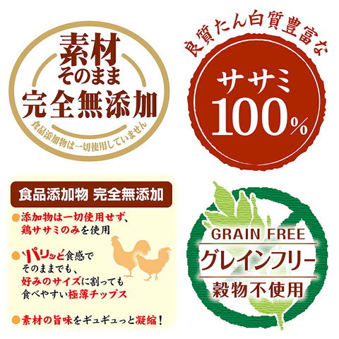 | 特長 | ●食品添加物完全無添加、鶏ササミを100%使用したおやつです。 ●パリッと食感でそのままでも、好みのサイズに割っても食べやすい極薄チップスです。 ●素材の旨みをギュギュっと凝縮しました。 ●グレインフリー(穀物不使用)なので、穀物アレルギーの愛犬にも安心です。 |