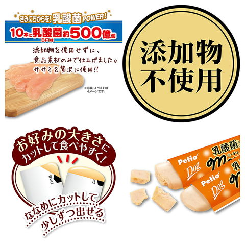 | 特長 | ●良質なたん白質が豊富なササミを贅沢に使用したおやつです。 ●10本に乳酸菌BFI株を約500億個配合でおなかの健康をサポートします。 ●添加物を使用せずに、食品素材のみで仕上げました。 ●袋のままお湯につけて人肌程度に温めるといっそう美味しくなります。 |