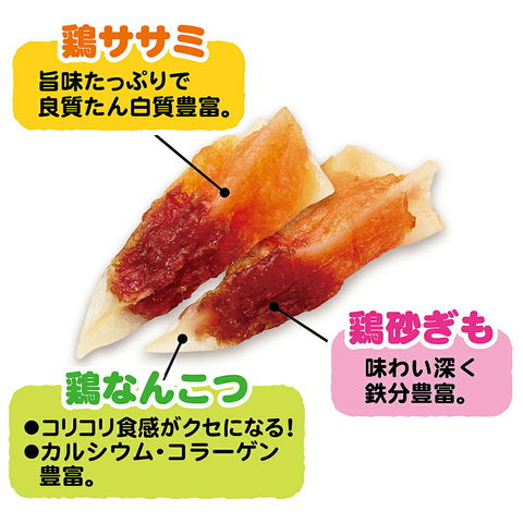 | 原材料 | 肉類(鶏ササミ・鶏砂ぎも・鶏軟骨)、グリセリン、酸化防止剤(亜硫酸Na) |