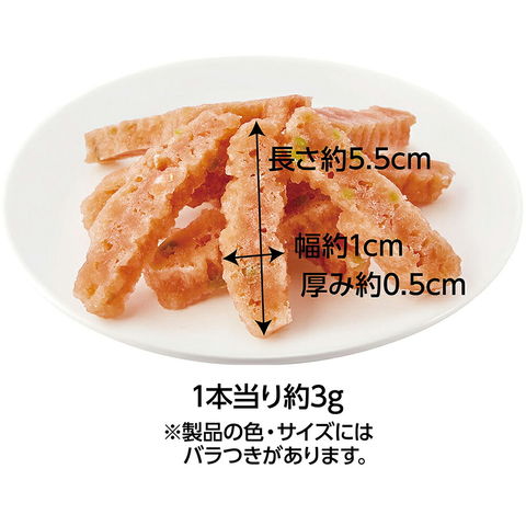 | 原材料 | 肉類(鶏・鶏ササミ)、小麦粉、コラーゲン、米粉、たん白加水分解物、食塩、難消化性デキストリン(水溶性食物繊維)、オリゴ糖、乳酸菌(GTL株・KH-2株(熱処理済))、にんじん、ほうれん草、ソルビトール、加工でんぷん、グリセリン、膨張剤、リン酸塩(Na)、炭酸Ca、カゼインNa、着色料(紅麹・クチナシ) |