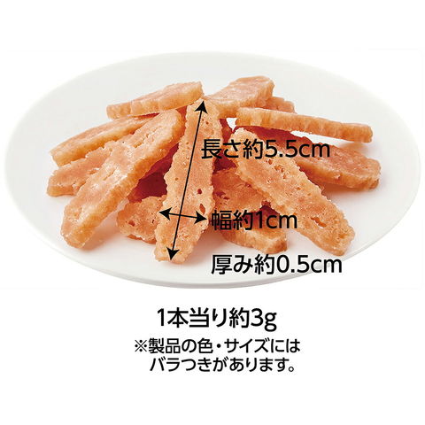 | 原材料 | 肉類(鶏・鶏ササミ)、小麦粉、コラーゲン、たん白加水分解物、食塩、難消化性デキストリン(水溶性食物繊維)、オリゴ糖、乳酸菌(GTL株・KH-2株(熱処理済))、ソルビトール、加工でんぷん、グリセリン、膨張剤、リン酸塩(Na)、カゼインNa、着色料(紅麹) |