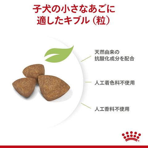 ●生後10ヶ月までの短い成長期に必要な高いエネルギー要求量を満たす特別な栄養設計で、超小型犬の子犬の成長をサポートします。 ●ビタミンEとCなど科学的に証明された独自の抗酸化成分を配合し、子犬の健康を維持し、免疫力の発達をサポートします。 ●科学的に証明されたオメガ3系不飽和脂肪酸(DHA)を配合し、子犬の健康的な脳の発達と成長初期のしつけ時の学習をサポートします。 ●プレバイオティックス(マンナンオリゴ糖)と高消化性タンパク質の組み合わせが、健康的な消化を維持し、腸内細菌バランスを整えます。 ●超小型犬の子犬に合わせた大きさのキブル(粒)に調整しました。 |