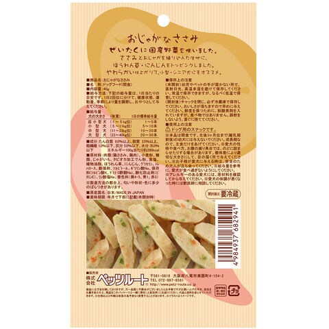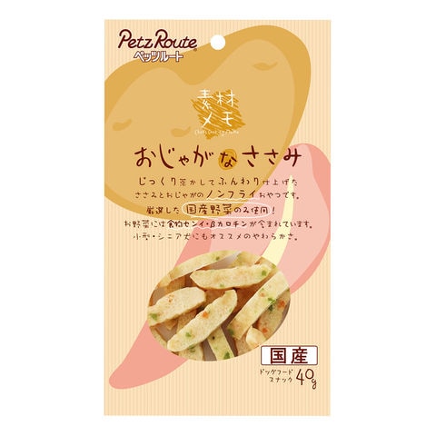 | 特長 | ●じっくり蒸かしてふんわり仕上げたささみとおじゃがのノンフライおやつです。 ●ぜいたくに国産野菜を使いました。 ●やわらかい仕上がりで、小型・シニア犬にもオススメです。 |