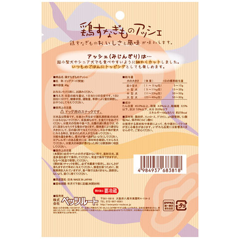 ペッツルート 素材メモ 鶏すなぎものアッシェ 40g 犬 おやつ 4984937683818 683818 オヤツ いぬ イヌ ドッグフード 犬フード 犬おやつ 間食 スナック 犬用 いぬ用 dog DOG トリーツ ご褒美 ごほうび トッピング ジャーキー みじん切り 鶏すなぎも 鶏砂肝 すなぎも 砂肝 鶏肉 チキン 高たんぱく 低カロリー 鉄分 食べやすい 超小型犬 小型犬 高齢犬 生後3ヶ月以上 シニア犬 老犬 国産 日本産 20260127 y26m01 ngtk