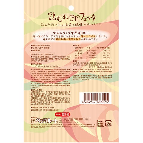 メーカー画像 ペッツルート 素材メモ 鶏むね肉のフェッタ 40g 4984937683825 683825 オヤツ いぬ イヌ ドッグフード 犬フード 犬おやつ 間食 スナック 犬用 いぬ用 dog DOG トリーツ ご褒美 ごほうび フェッタ 薄切り うす切り うすぎり 鶏胸肉 鶏むね肉 鶏肉 チキン 高たんぱく 低カロリー 食べやすい 超小型犬 小型犬 高齢犬 生後3ヶ月以上 シニア犬 老犬 国産 日本産 20260127 y26m01 ngtk