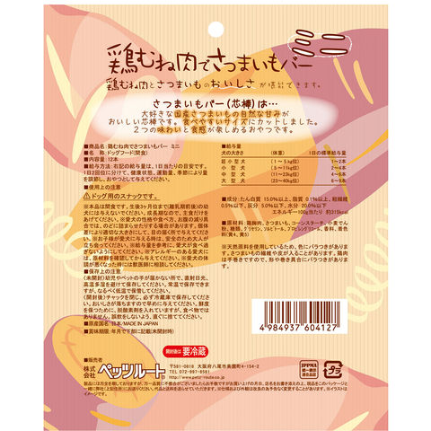 原材料 鶏胸肉、さつまいも、コーンスターチ、小麦でん粉、糖類、グリセリン、ソルビトール、プロピレングリコール、香料、着色料(黄4、黄5)