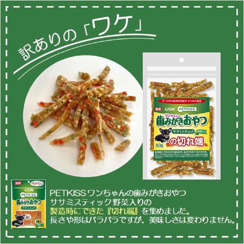 | アウトレット理由 | PETKISS ワンちゃんの歯みがきおやつ ササミスティック 野菜入りの製造時にできた『切れ端』のためお手頃価格となっております |